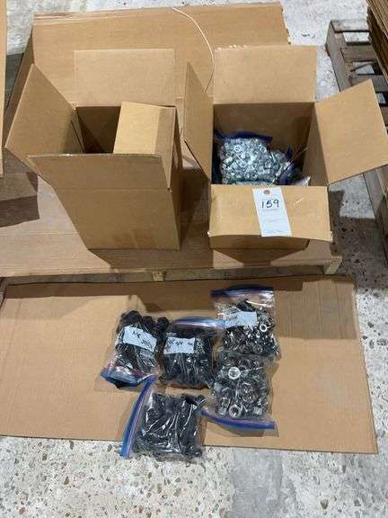 This lot features a variety of bolts, nuts, and other hardware components, neatly organized in bags and boxes. A useful selection for various projects and applications.