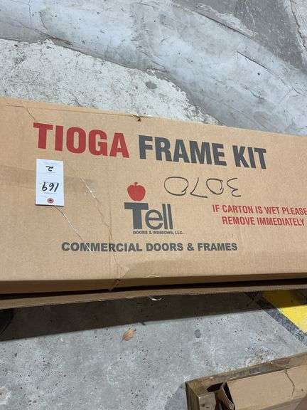 Tioga frame kit by Tell Commercial Doors & Windows, LLC. Contains parts and components for assembling commercial doors and frames. Includes various metal components and hardware.