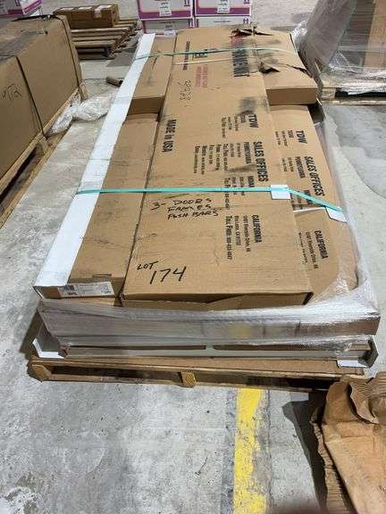 This lot includes a pallet of door frames and push bars. The pallet includes materials for 3 doors. See photos for more details.